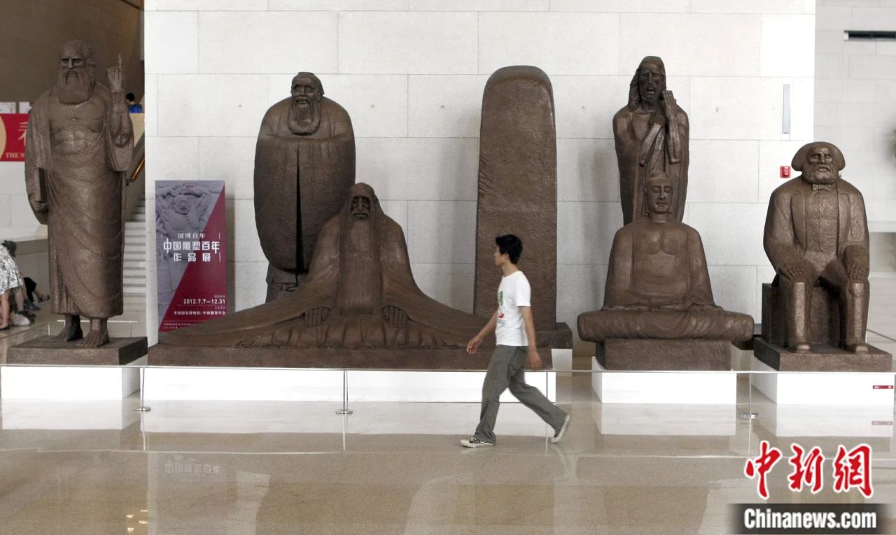 观众从中国“国博百年·中国雕塑百年作品展”里一件将苏格拉底、孔子、老子、耶稣、释迦牟尼、马克思等古今中外圣贤排列在一起的作品前走过。张浩 摄