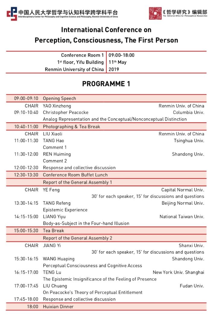 日期:2019-03-212019年5月11日、12日,由中国人民大学哲学与认知科学跨学科平台主办的“知觉、意识、第一人称”国际学术研讨会(International Conference on Perception, Consciousness, The First Person)将在中国人民大学逸夫楼一层第1会议室召开。主要与会人员包括来自哥伦比亚大学的英国哲学家Christopher Peacocke 以及来自其它中国高校的哲学学者。